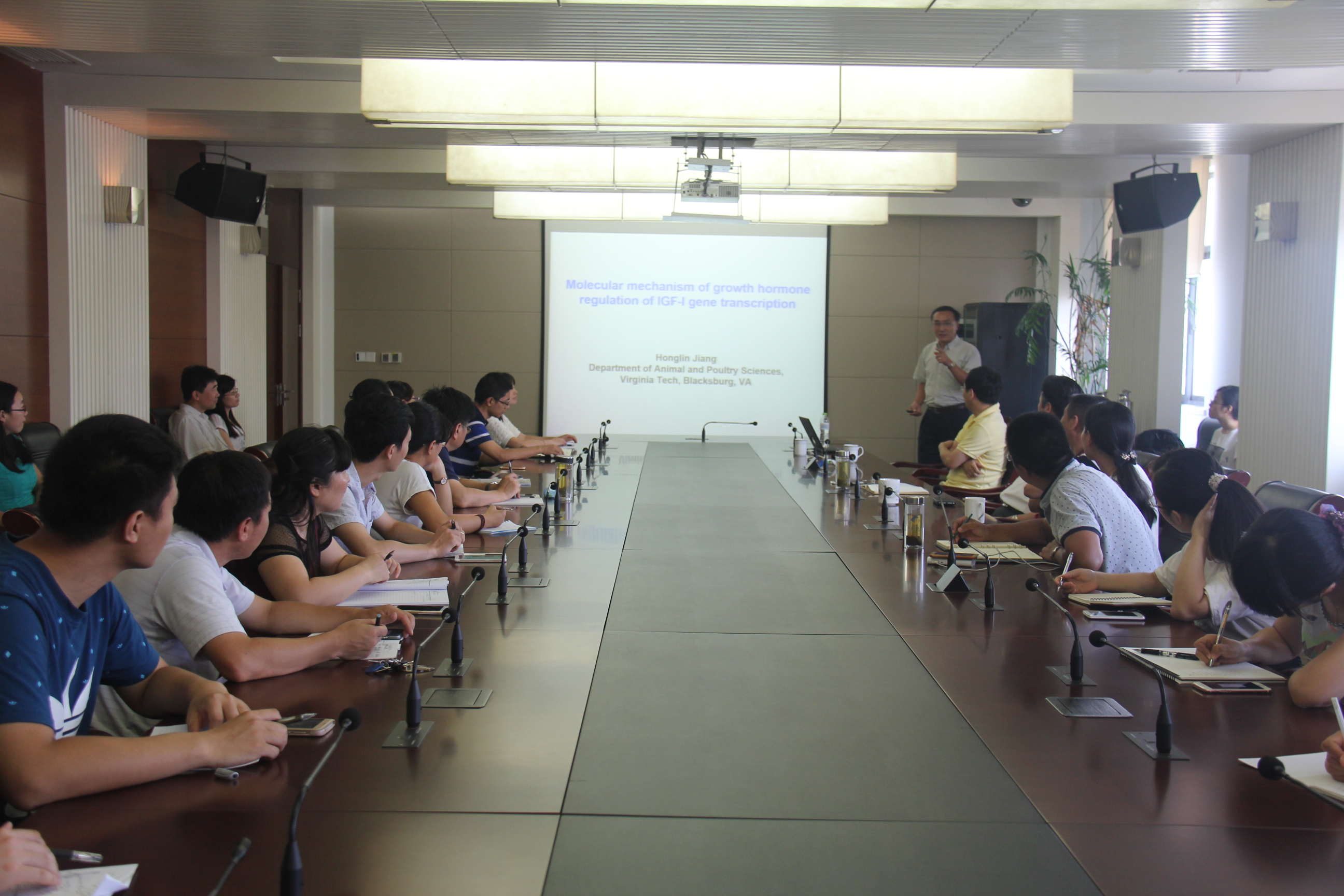 姜洪林教授现任弗吉尼亚理工大学动物和家禽科学系教授,长期专注于动物发育生物学、内分泌、基因组学以及营养生理研究。会上姜教授介绍了他和他的团队在生长激素调控类胰岛素一号生长因子(IGF-I)表达分子机制的研究领域取得的成果和经验,与会科研人员深受启发,并结合自身研究领域与姜教授进行了热烈的交流与讨论。